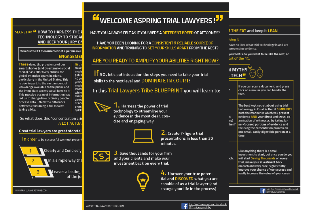 In this value-packed ebook, we give you all the tips, tricks, strategies & hacks that helped us get here... and helps you beat the curve on your way to becoming a dominant trial lawyer.